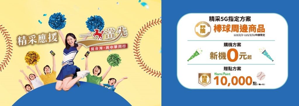 有申辦行動網路需求的用戶,中華電信配合即將到來的2026年世界棒球經典賽,推出「精采應援、一馬當先」活動。即日起至3月31日止,用戶申辦精采5G指定方案,完成登錄可抽棒球周邊商品,另外精采5G購機方案搭配指定手機可享0元優惠價,若申辦精采5G贈點方案則最高可獲得1萬點Hami Point點數。
