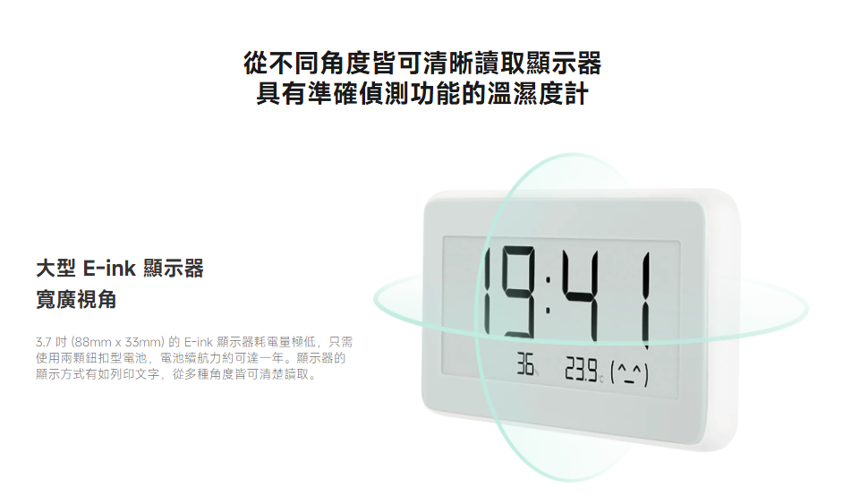 小米電子溫濕度計Pro具備3.7吋電子紙螢幕,也因為其特性可視角非常大,且電子紙低功耗的特性,讓它只需要用2顆CR2032電池就能有1年的續航力。