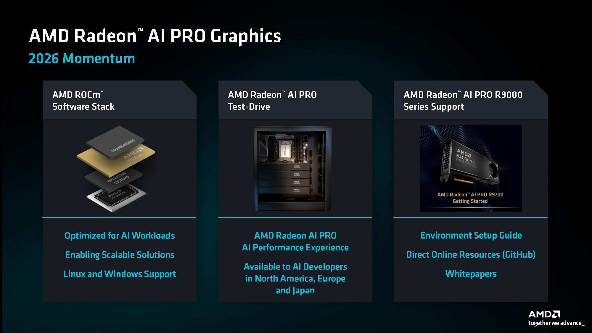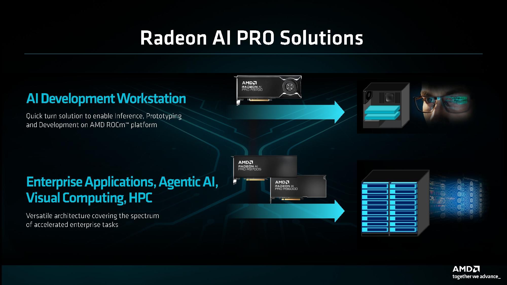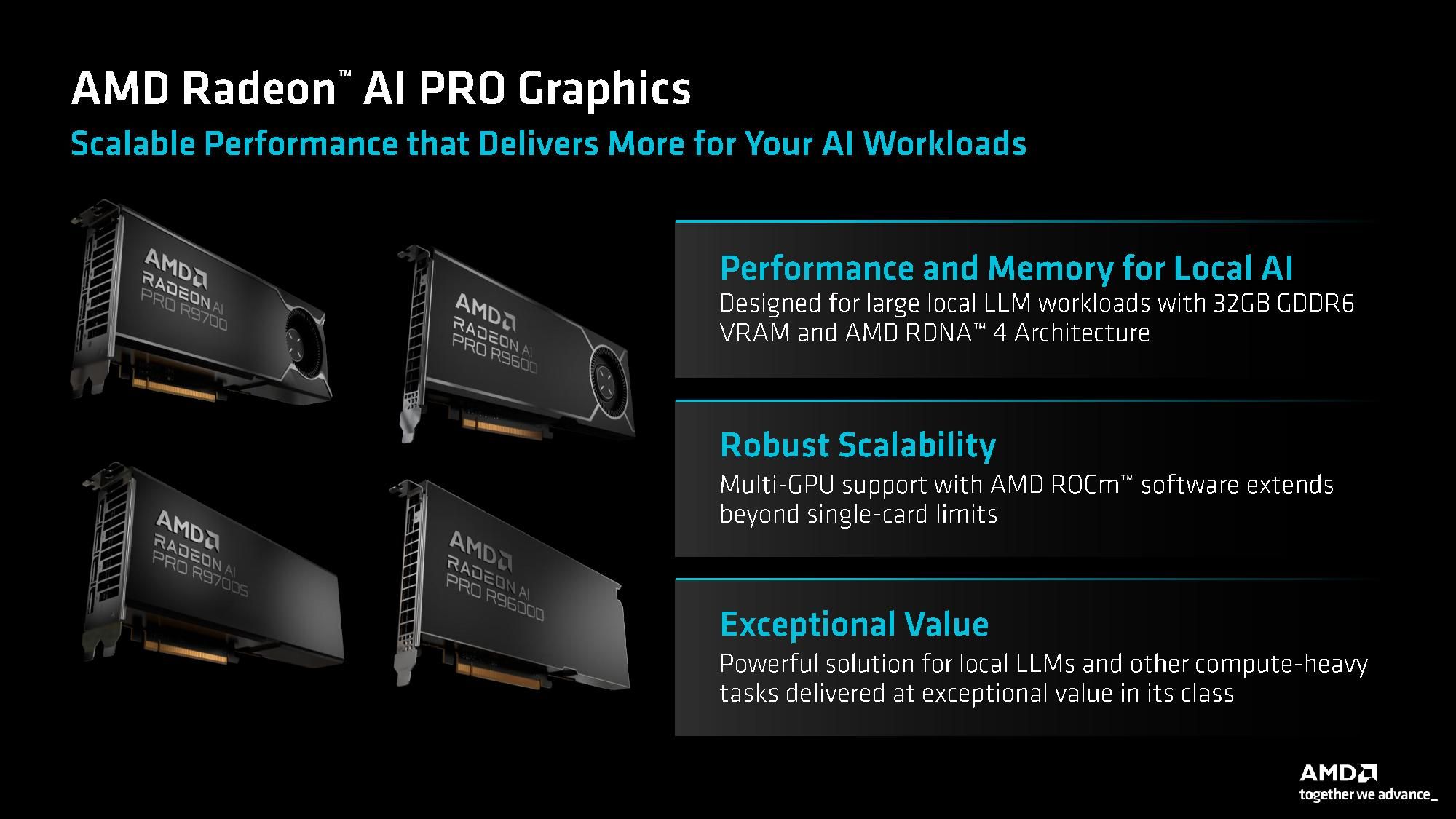 AMD也同場宣布繼2025年Computex公布的Radeon AI Pro R9700後,再追加3款Radeon AI Pro R9000顯示卡,包括Radeon AI Pro R9700S,Radeon AI Pro R9600與Radeon AI Pro R9600S,專注於裝置端執行大型語言模型,具備大容量記憶體,以及可透過ROCm進行多卡串接擴展記憶體容量與運算性能。