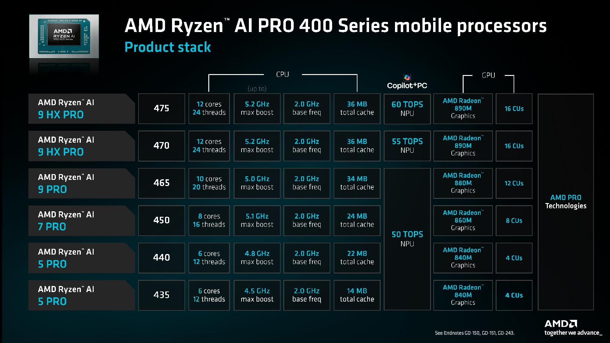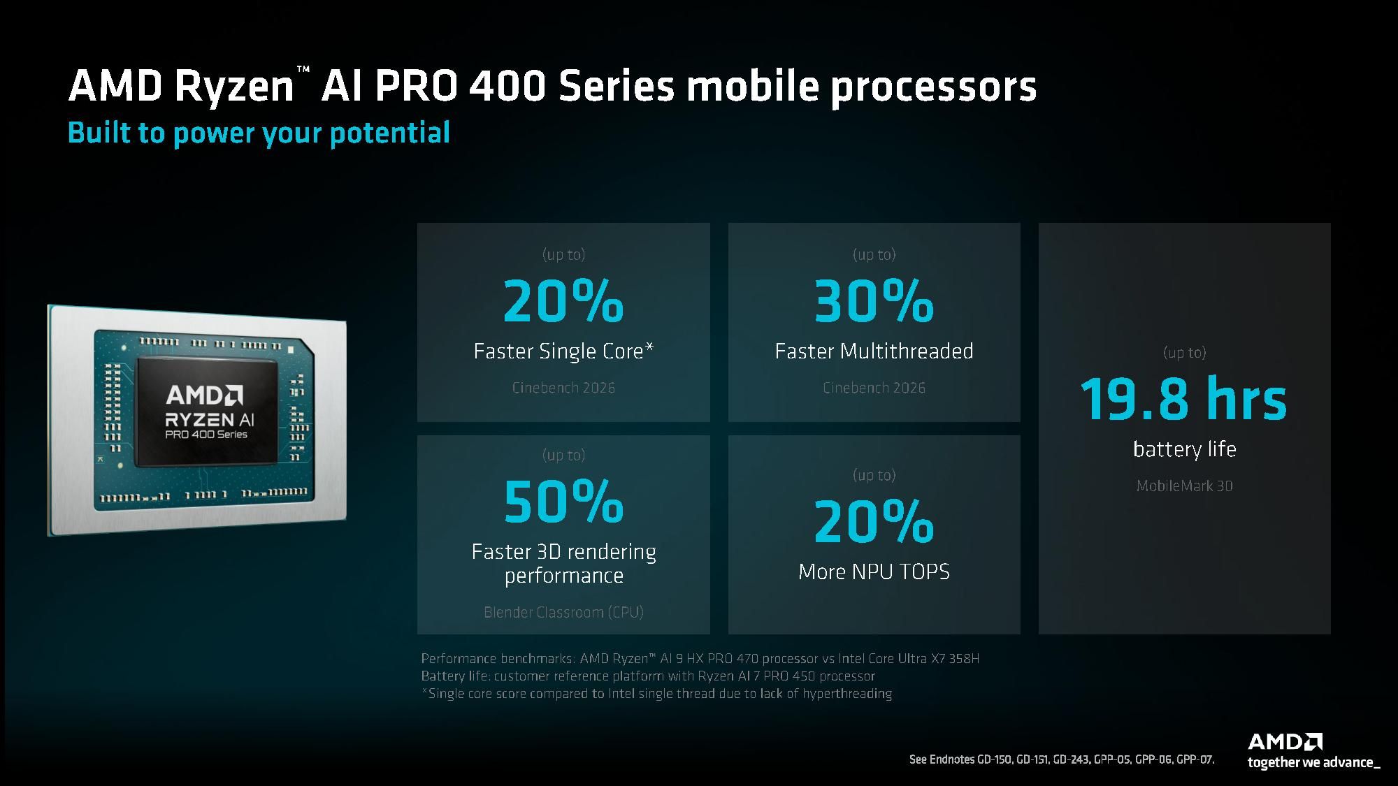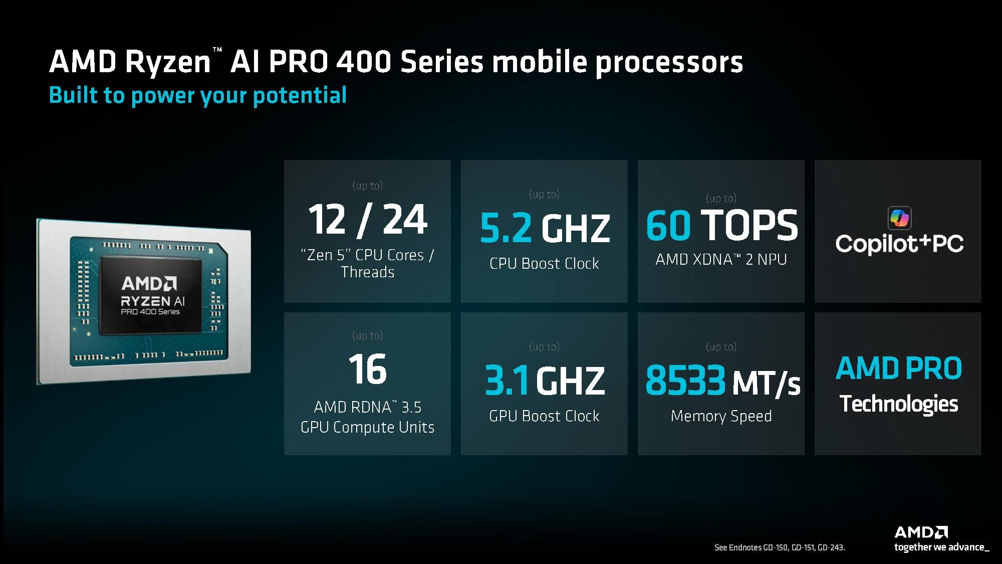 Ryzen AI Pro 400系列行動版處理器提供最高12核心24執行緒、5.2GHz Boost時脈,相較前一代CPU單核心效能提升20%、多核心效能提升30%,及最多3.1GHz、16核心的RDNA 3.5架構GPU,3D渲染效能提升50%,其XDNA 2 NPU可達最高60 AI TOPS性能,比前一代提升20%效能,並支援LPDDR5 8533MTs的記憶體時脈,同時採用Ryzen AI Pro 400的筆電最高可達19.8小時續航力。