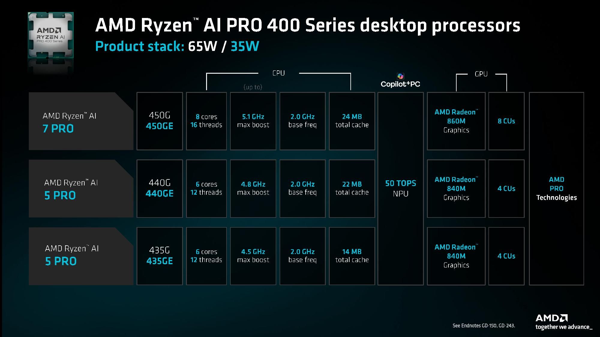 Ryzen AI Pro 400系列桌上型處理器是AMD首次將支援Copilot+ PC體驗的XDNA 2 NPU引入桌上型平台,提供最多8核心16執行緒與5.1GHz Boost時脈,搭配最多8核心3.1GHz的RDNA 3.5GPU,其NPU可達最高50 AI TOPS效能。