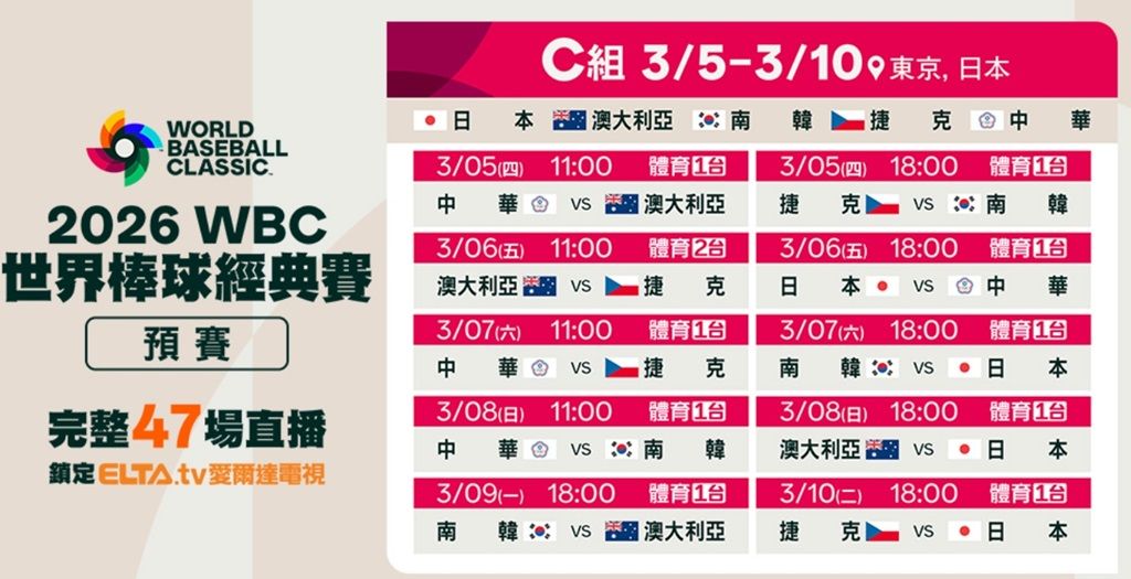 2026年WBC預賽分為4個小組進行,中華隊與日本、韓國、捷克、澳洲一同劃分在C組,將在日本東京巨蛋進行4場比賽,爭奪晉級的資格。台灣的球迷若想要線上收看WBC中華隊比賽直播,可以訂閱中華電信Hami Video或是愛爾達電視,其中Hami Video推出399元棒球加油包,用戶可獲得90天電視運動館收視服務,可觀看包括愛爾達、博斯等運動頻道,以及TVBS、東森等新聞台。