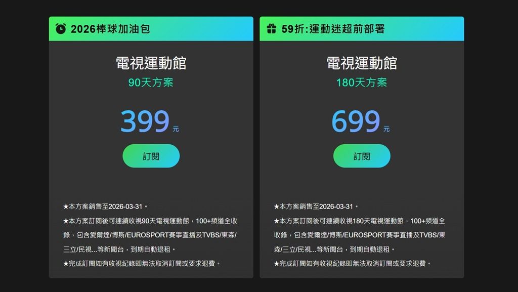 ▲Hami Video電視運動館目前提供2個訂閱方案,分別為90天399元棒球加油包,以及180天699元運動迷超前部屬方案。圖片來源