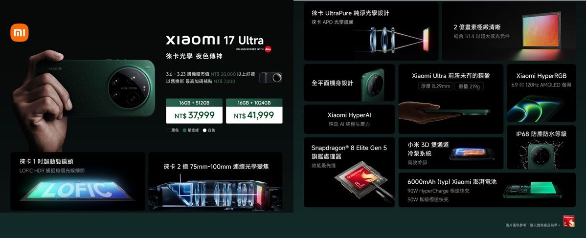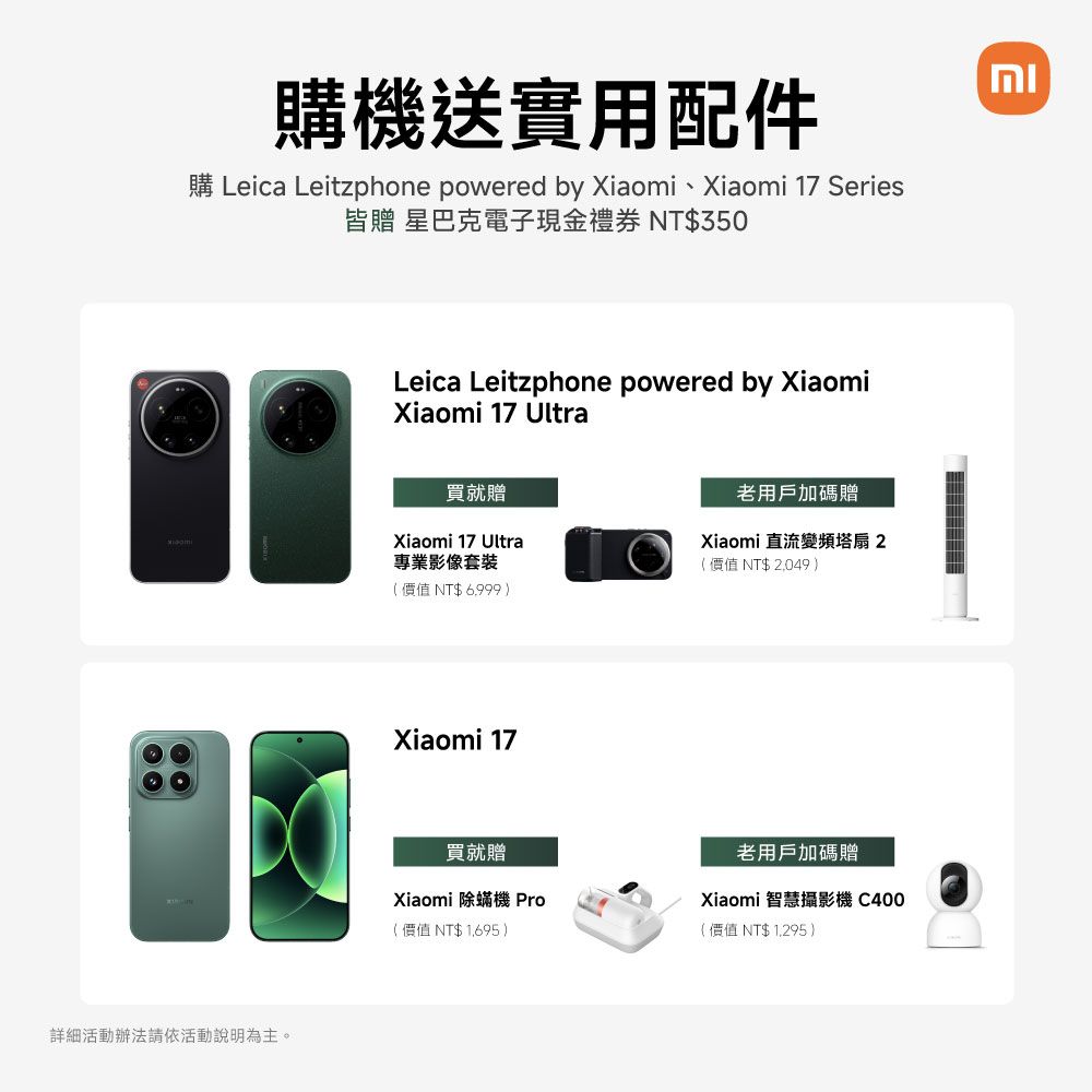 ▲Ultra與Leitzphone早鳥禮為專業影像套件、Xiaomi 17早鳥為除蟎機Pro,老用戶有額外加碼