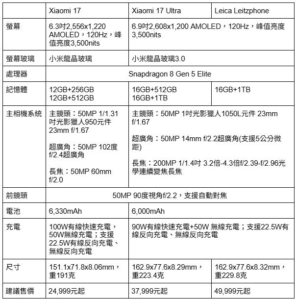 Xiaomi 17提供12GB搭配256GB及512GB兩種規格,建議售價分別為24,999元與26,999元;Xiaomi 17 Ultra提供16GB+512GB及16GB+1TB,建議售價分別為37,999元及41,999元;Leica Leitzphone提供16GB+1TB單一版本,建議售價為49,999元。Xiaomi 17 Ultra及Leitzphone早鳥禮為專業影像套件,Xiaomi 17早鳥禮為