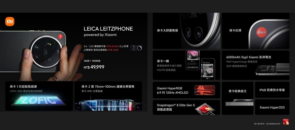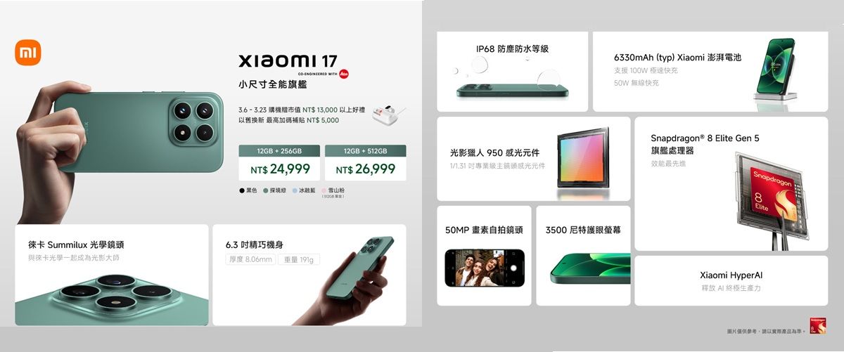 小米於2026年3月6日在台灣正式推出Xiaomi 17系列,包含標準機型Xiaomi 17以及旗艦機型Xiaomi 17 Ultra,同時還有以Xiaomi 17 Ultra為基礎的特別版Leica Leitzphone,三款機型皆為高通Snapdragon 8 Elite Gen 5平台,並具有徠卡影像技術加持,其中Xiaomi 17 Ultra及Leitzphone還搭載連續光學長焦鏡頭,而作為特別版與徠卡深度合作的Leitzphone除了特別版的機身設計外,還加入變焦環與Leica M3、Leica M5拍攝模式,增添尊榮感。