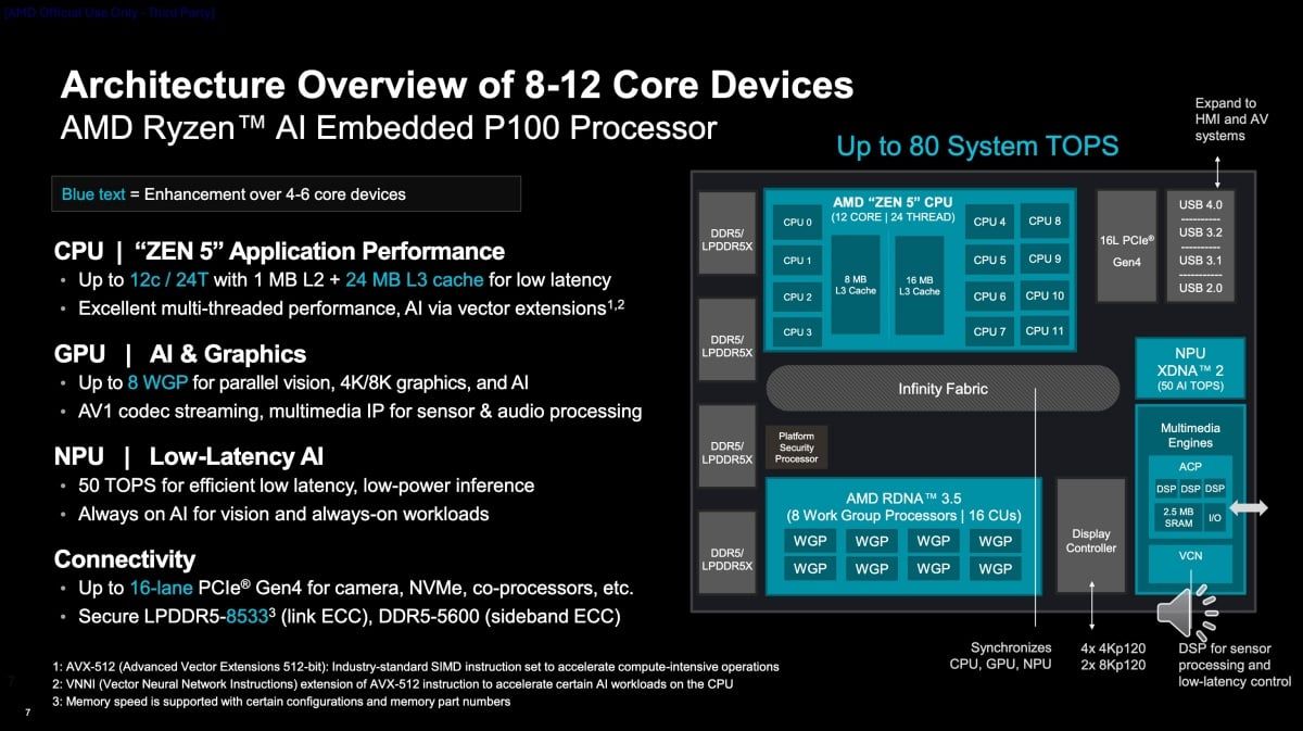 新款的Ryzen AI P100系列嵌入式處理器,可以說是AMD將旗下最新架構加總後,針對邊緣運算極致最佳化的成果。
