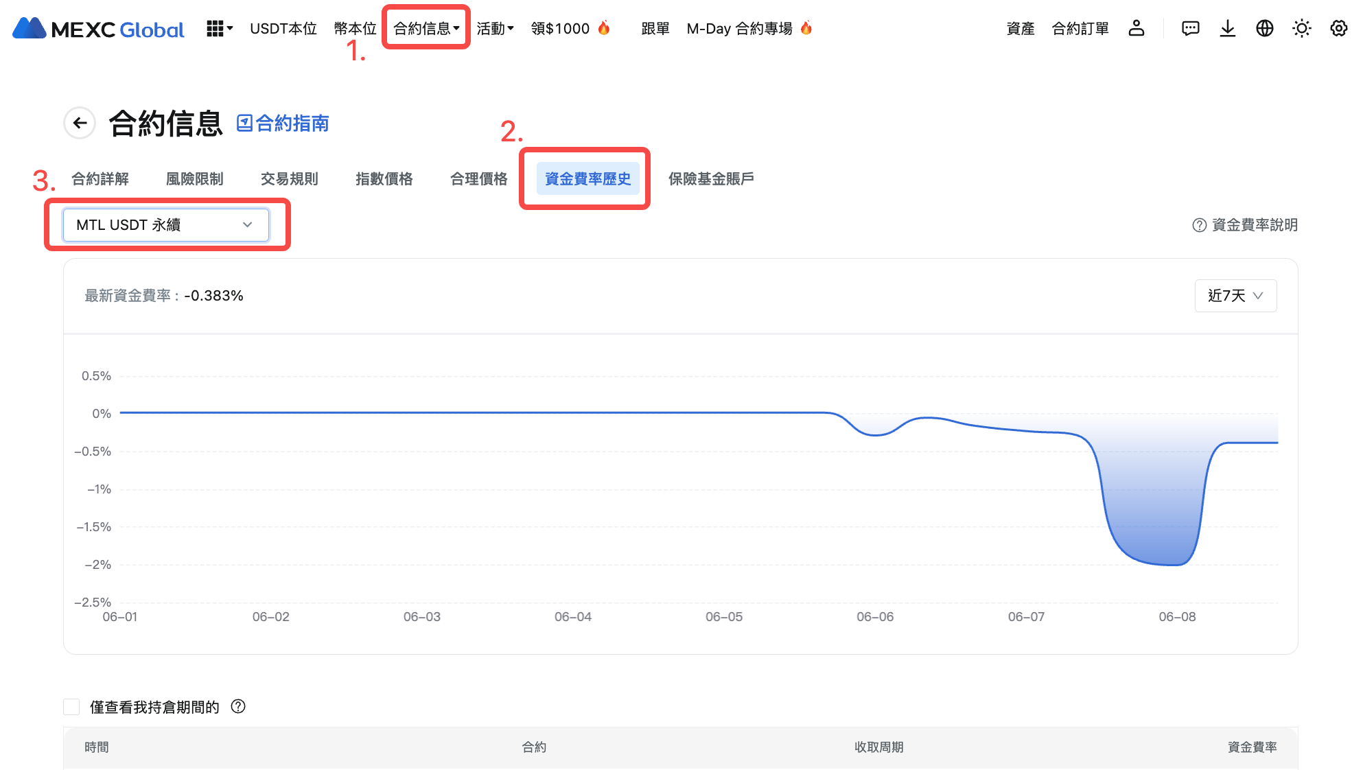 您可以通過“合約信息-資金費用歷史”了解最新的資金費率詳情。